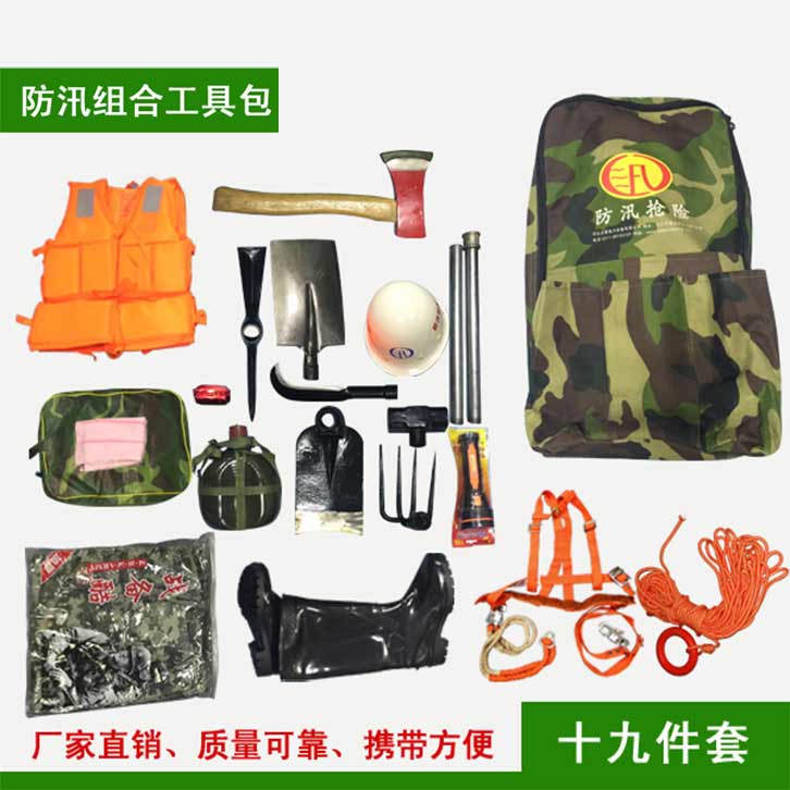防汛組合工具包19件套:鎬、鈀、鋤頭、十磅錘、砍刀、方鏟、電筒、水鞋、防汛戰(zhàn)斗服、防寒雨衣、救生繩、雙背帶、救生衣、毛巾、水壺、頭盔、消防斧頭、信號燈、工具包。該組合工具包輕便、工具配備齊全適用于救援隊員使用。