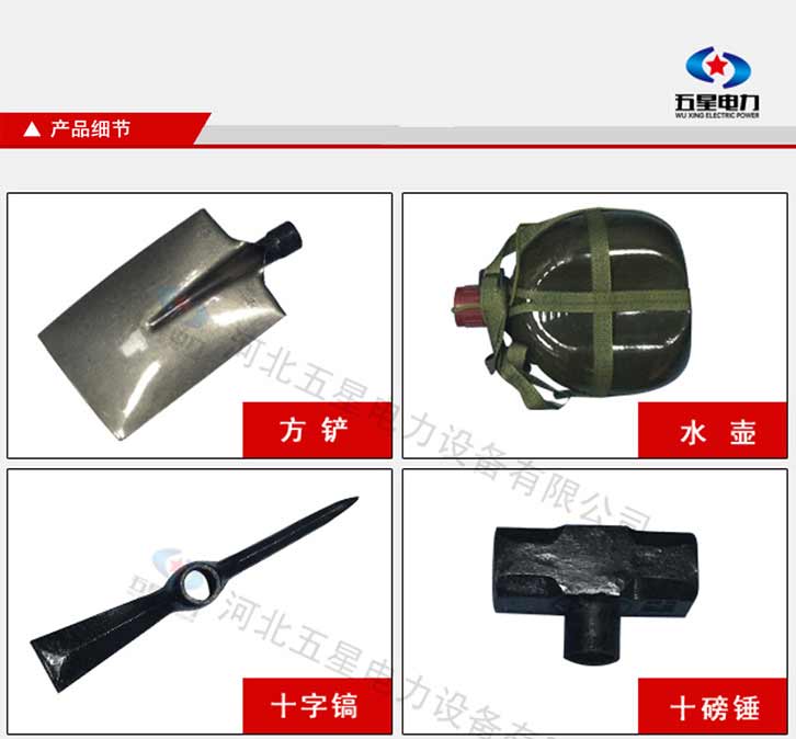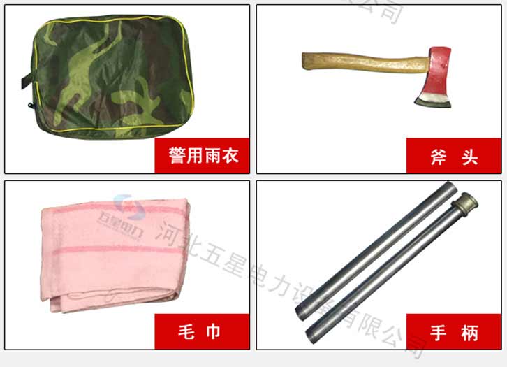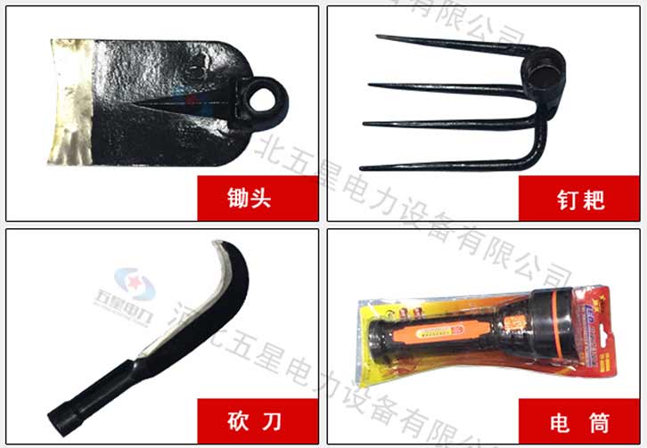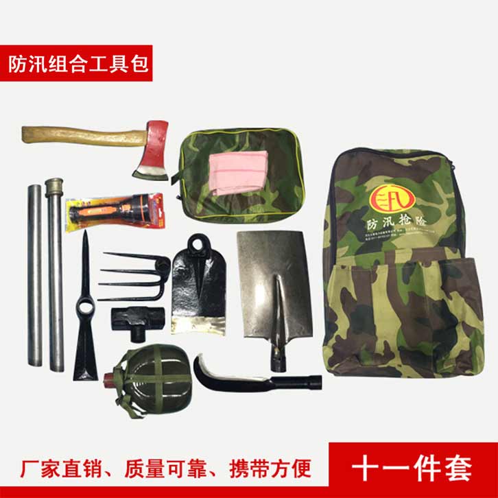 防汛組合工具包十一件套:鎬、鈀、鋤頭、十磅錘、砍刀、方鏟、電筒、警用分體雨衣、毛巾、水壺、頭盔。共用一條活動柄。該組和輕便,工具配備齊全適用于救援隊員使用。