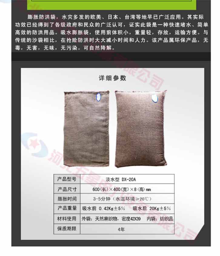 吸水膨脹袋內裝的是新型的高分子納米吸水物質,這種物質無毒、無味、無污染,吸水膨脹前為極小的顆粒物質,吸水后為黑豆大小的含水物質,干凈且無公害,待高分子吸水物質使用后可用于農業保水抗旱,所以在洪水過后可就地將袋內的物質傾倒入農田中,在泥土中可完全分解,是綠色環保、一舉兩得的首選產品。外袋為純麻布和棉布織成,遇水后麻繩可更加結實耐磨。